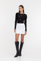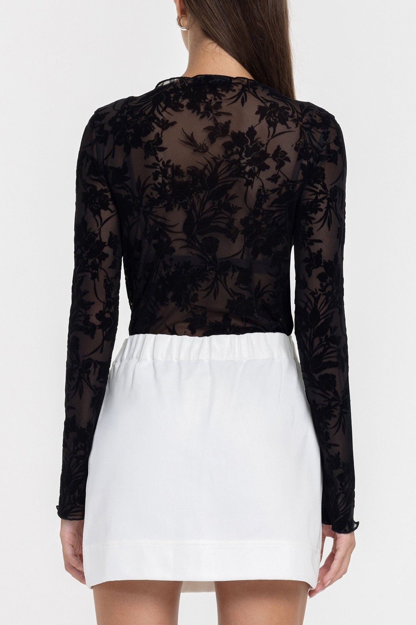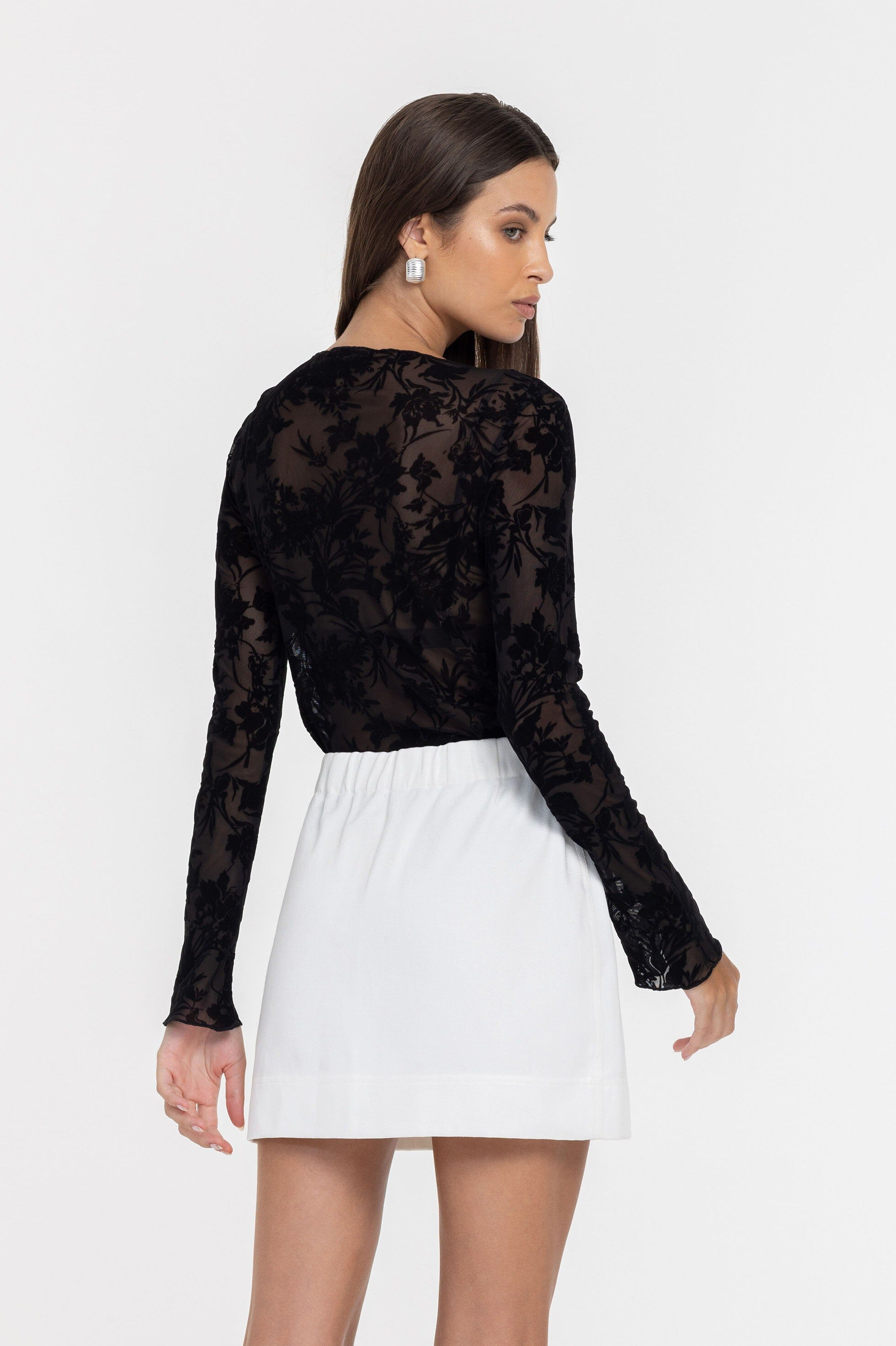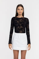 Romantic and effortlessly refined, the Gigi Top in Black Floral plays with transparency and texture. A sheer stretch mesh base is overlaid with soft flocked florals, creating depth and movement while remaining light against the skin. Equal parts delicate and confident, it’s designed to layer, reveal and elevate.