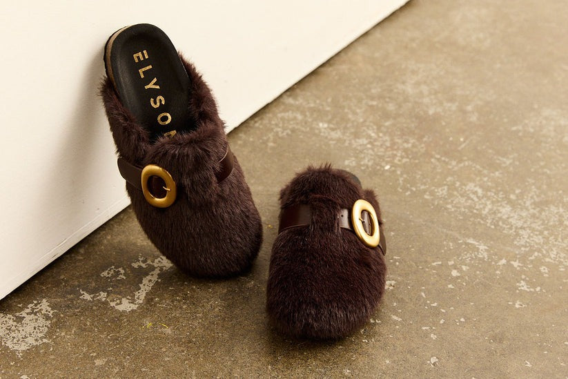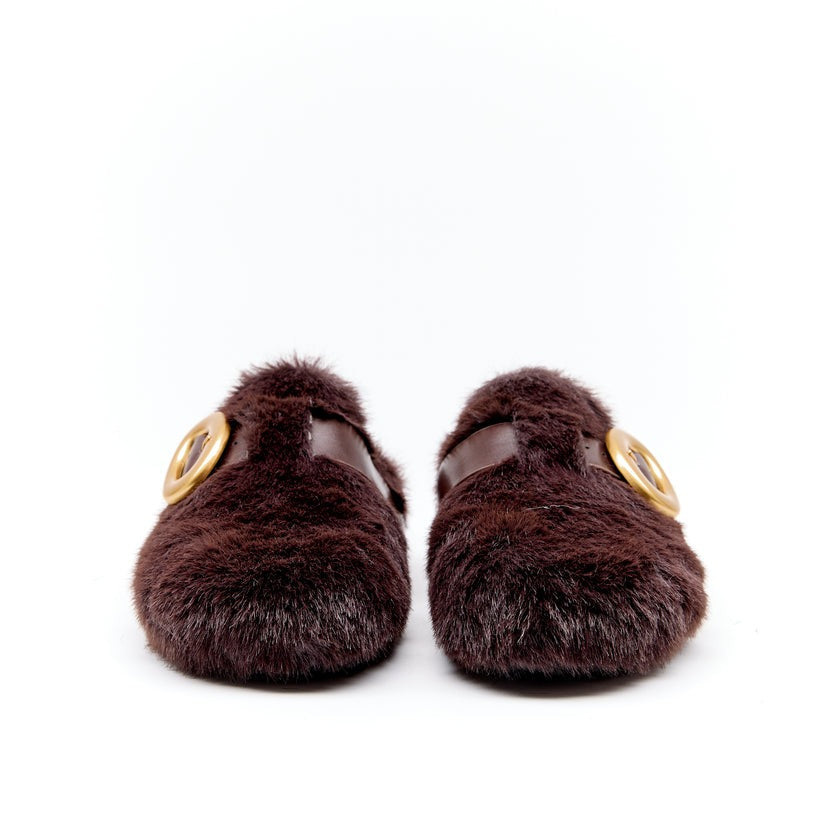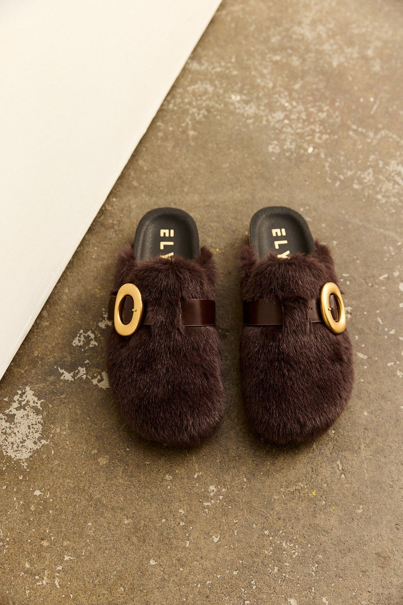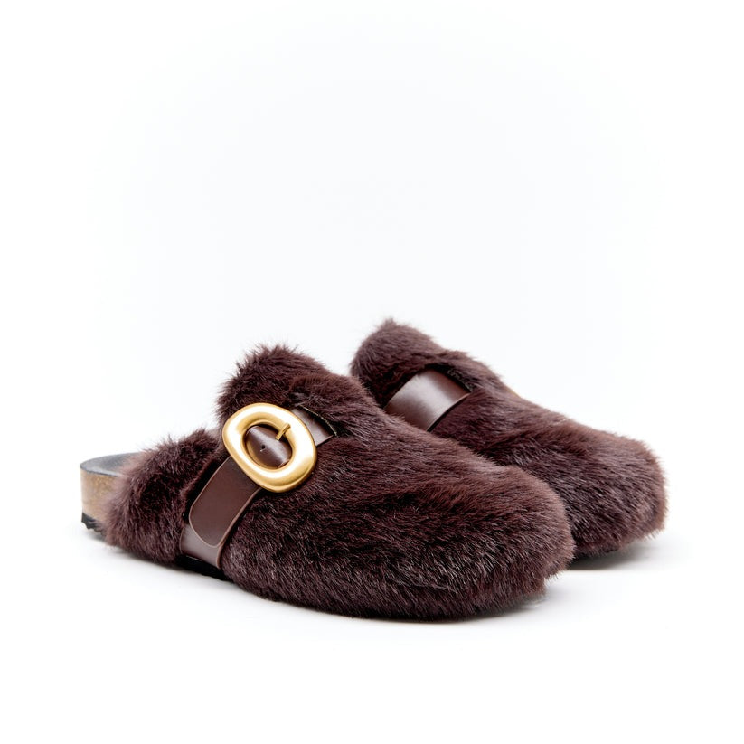 Crafted in rich deep chocolate faux fur, the slip-on silhouette is finished with a wide leather strap and oversized gold buckle for a striking, modern edge.