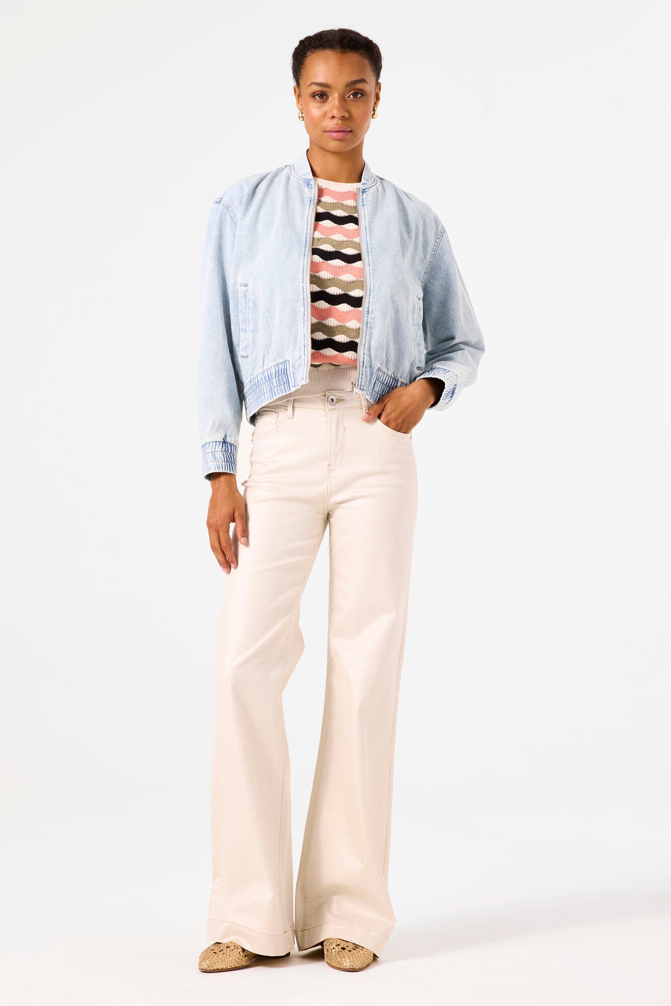 This light wash bomber jacket blends casual streetwear with a timeless, laid-back appeal. Crafted from soft, faded cotton denim, it features a zip front closure, ribbed hem and cuffs and angled side pockets for a relaxed yet structured silhouette.