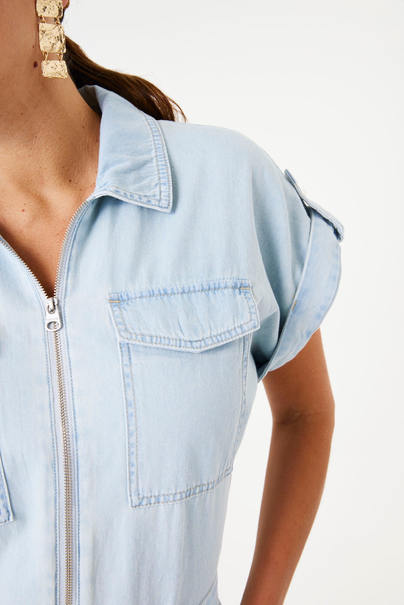 Cool and contemporary, this denim jumpsuit is craftd from soft, light wash denim for an effortless off-duty look.