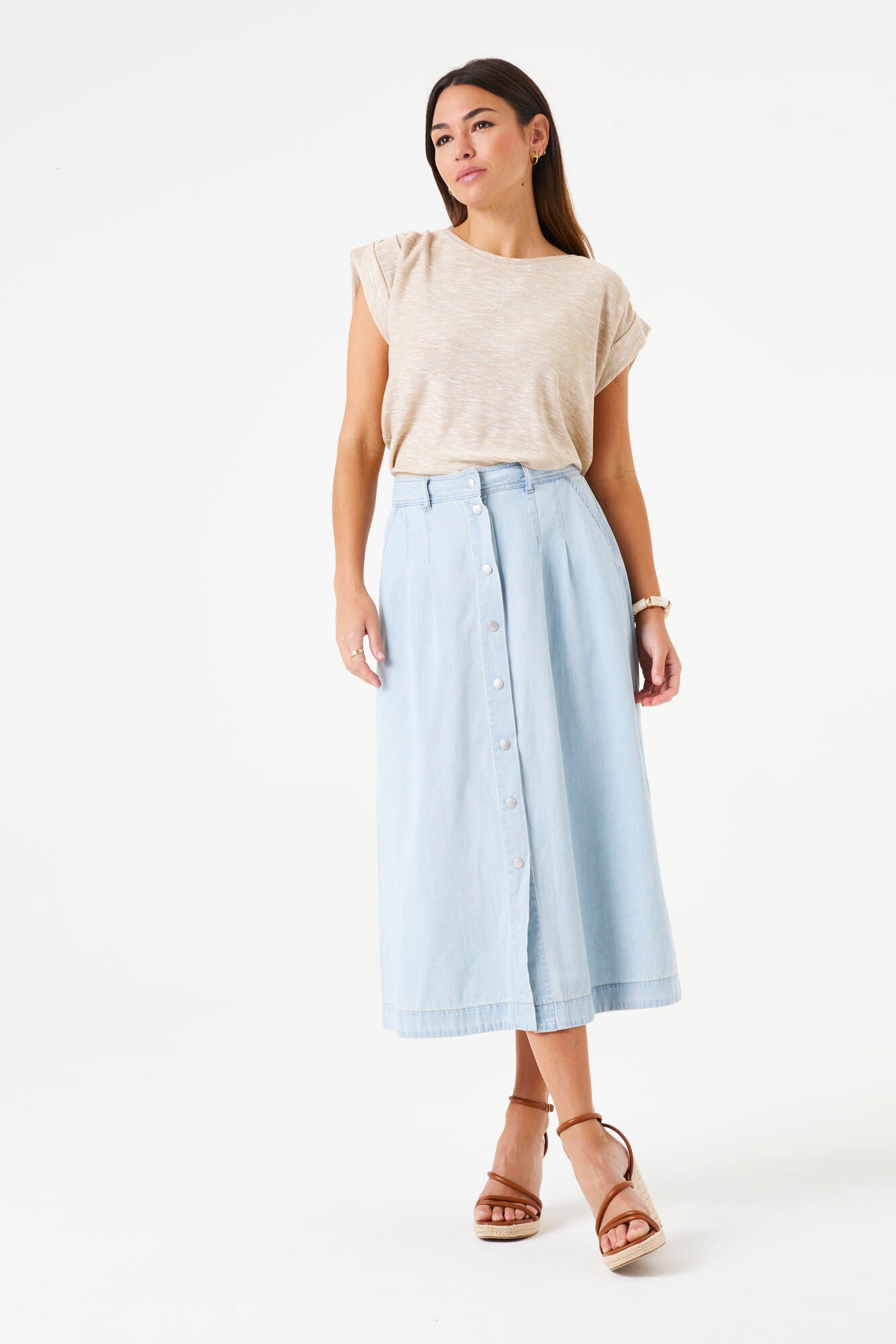 A timeless wardrobe staple, this natural-toned tee is crafted from a soft linen blend with subtle shoulder gathers for a touch of feminity.