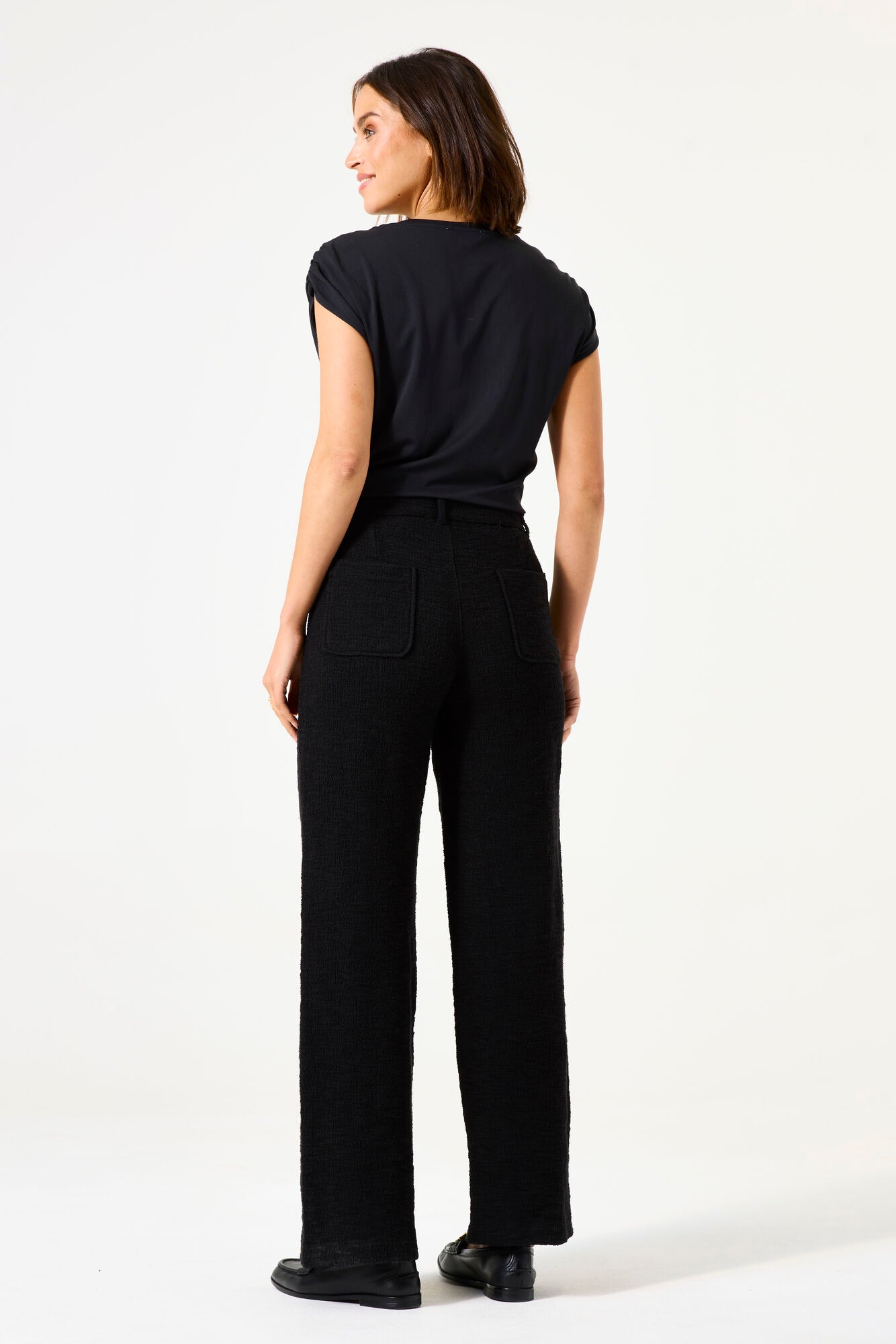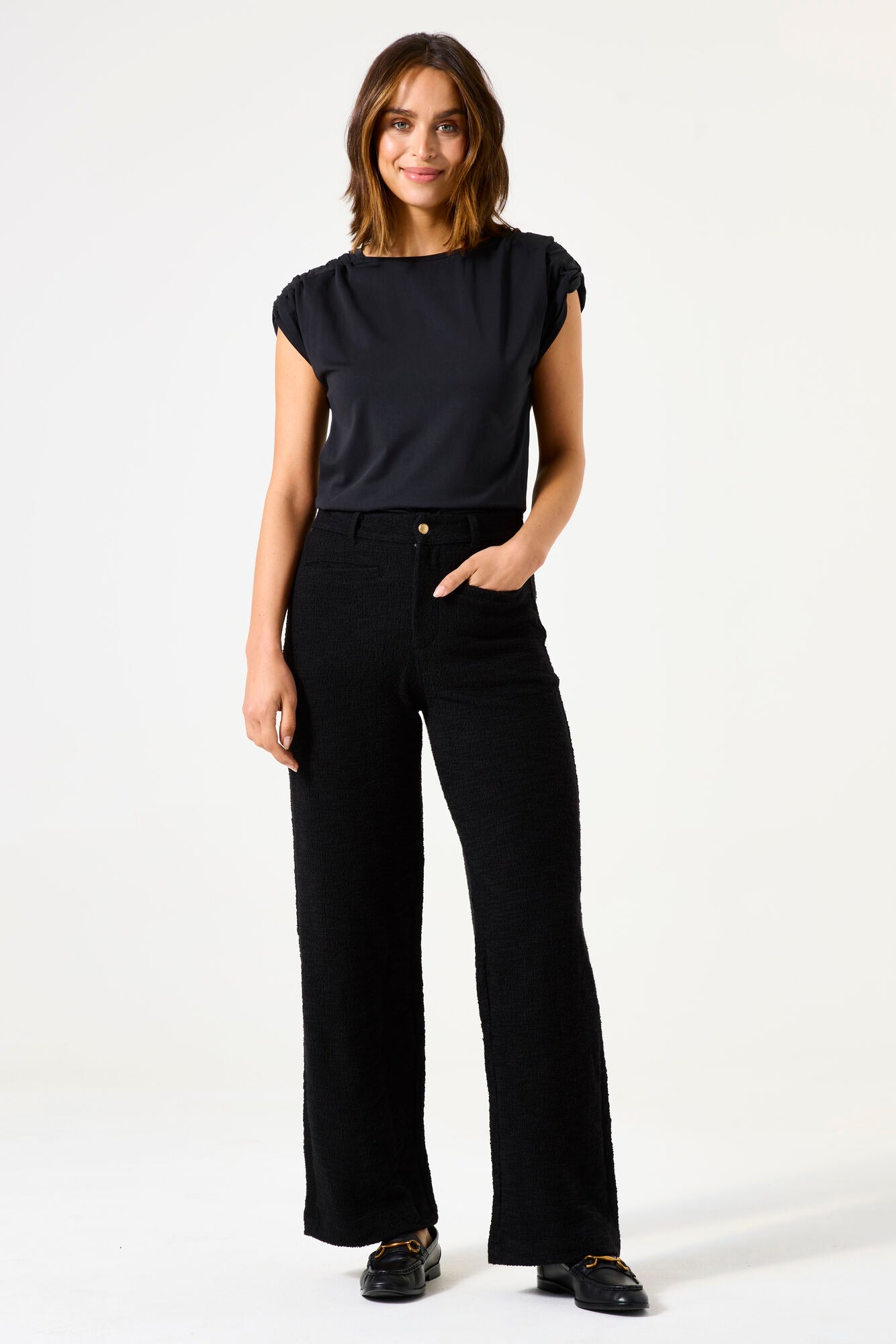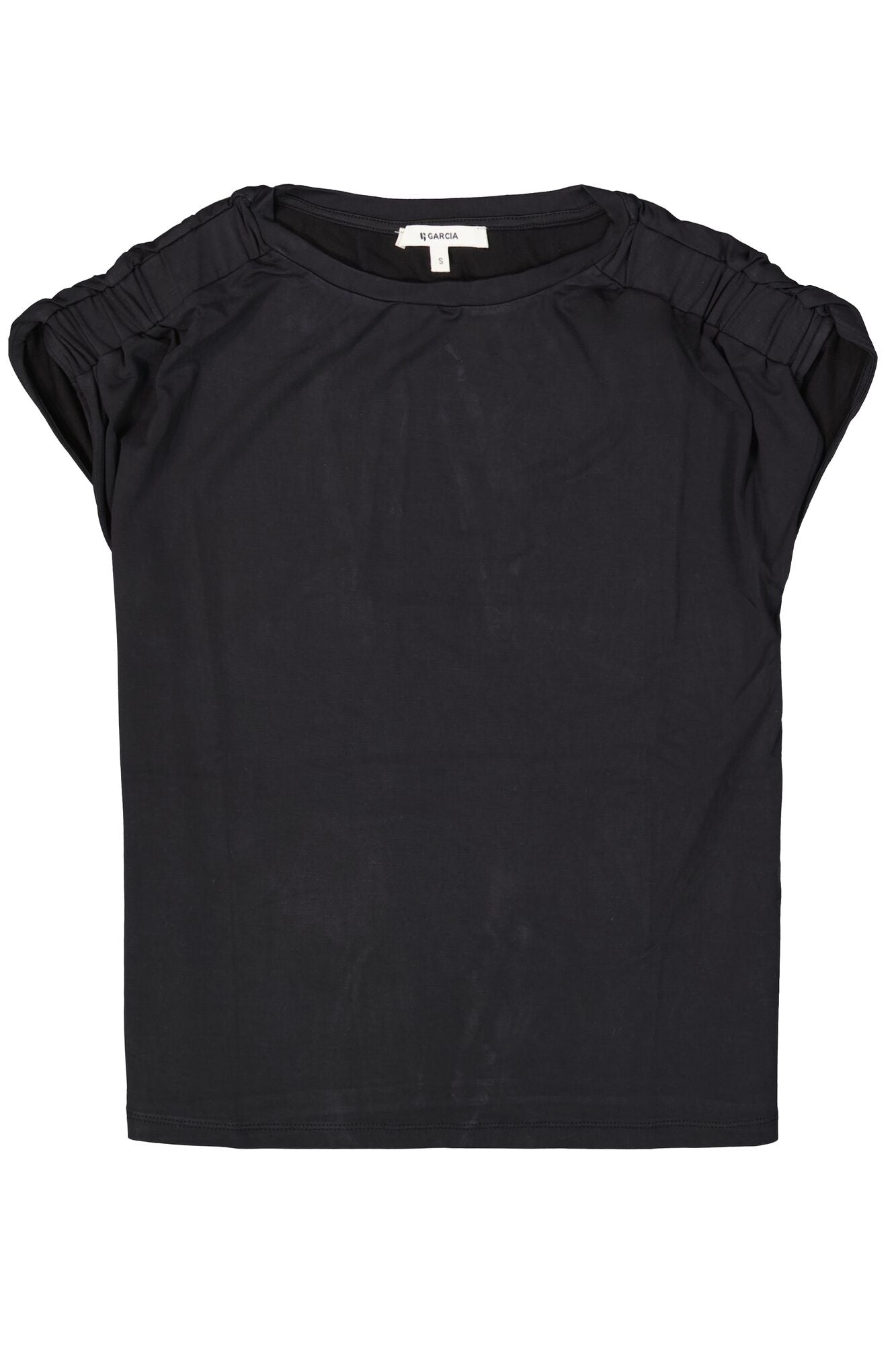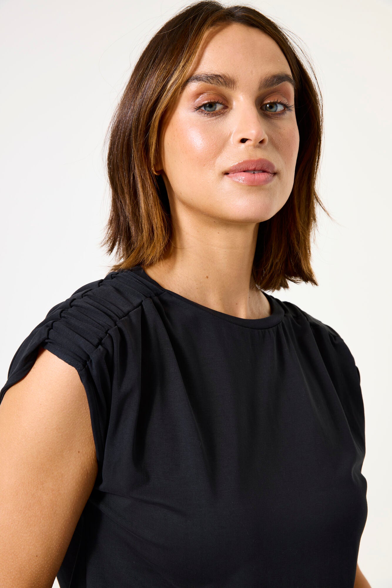 Short sleeve tee in a classic black. Designed with a round neckline, it features softly gathered detailing along the shoulders giving a subtle feminine touch to an otherwise minimal silhouette. Made from lightweight cotton fabric, the tee offers comfort and breathability while keeping a clean, versatile look.