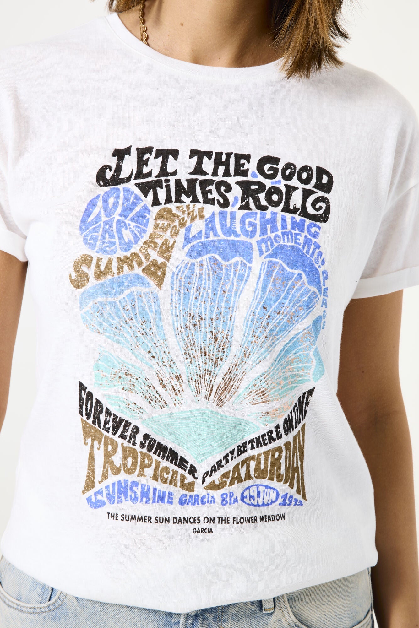 Short sleeve crew neck tee in white, designed with a bold retro-inspired front print. The colourful graphic features a large shell motif surrounded by playful typography in shades of black, blue and gold with phrases such as "Let The Good Times Roll" "Forever Summer" "Tropical Saturday" and "Sunshine".