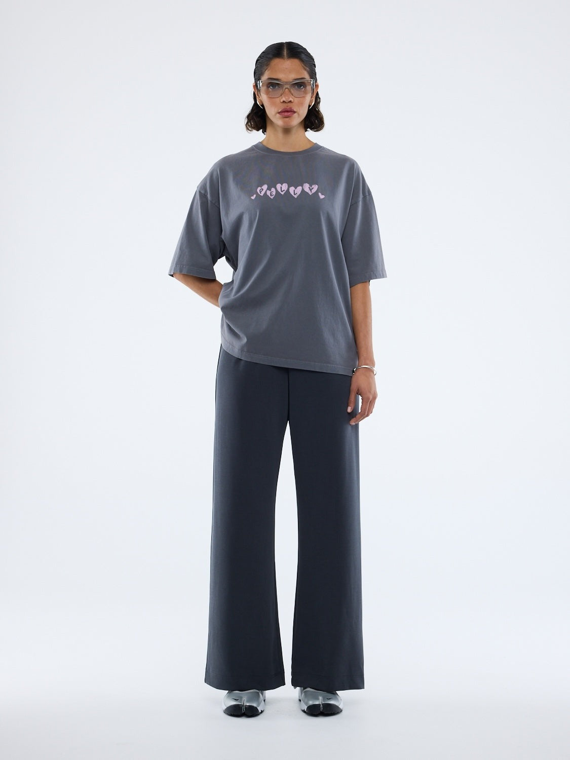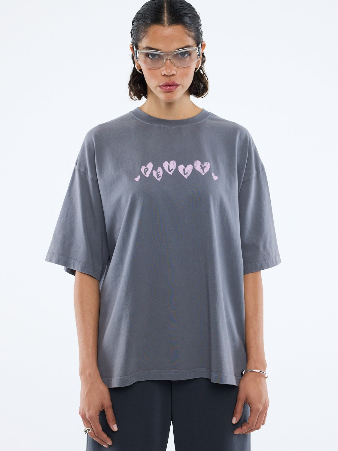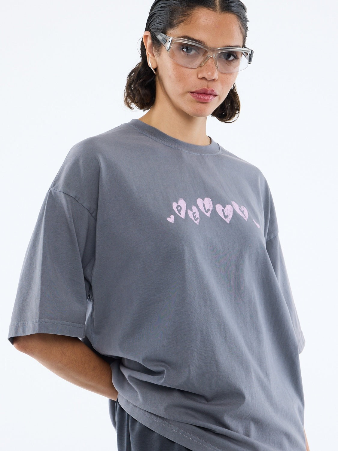 Street attitude, everyday appeal. The Pelly Spray Heart tee is cut from soft, washed grey cotton in an oversized silhouette with a classic crew neckline. Finished with a spray painted heart graphic. Its designed to move through moods and moments. A statement tee with effortless, street inspired energy.