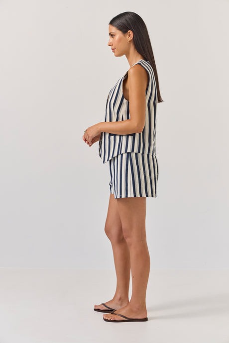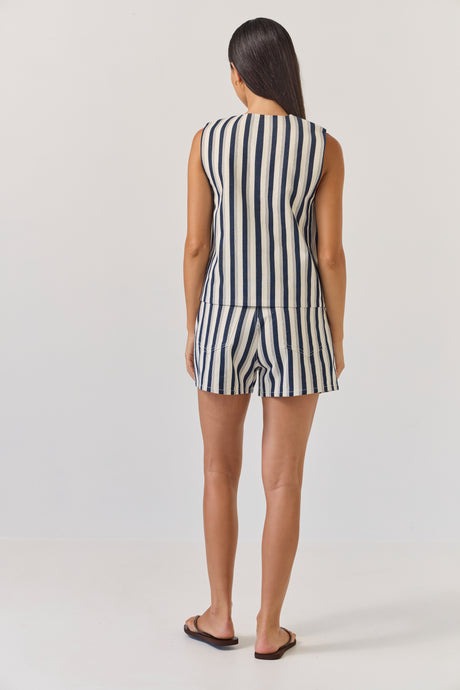 Our favourite vest shape featured in denim for the first time. This style can be worn on its own or layered over a shirt or tee. Wear with the matching Oakley Pants or Electric Shorts for a statement look, or simply add to your own wardrobe pieces. This stripe looks great back with solid denim too.