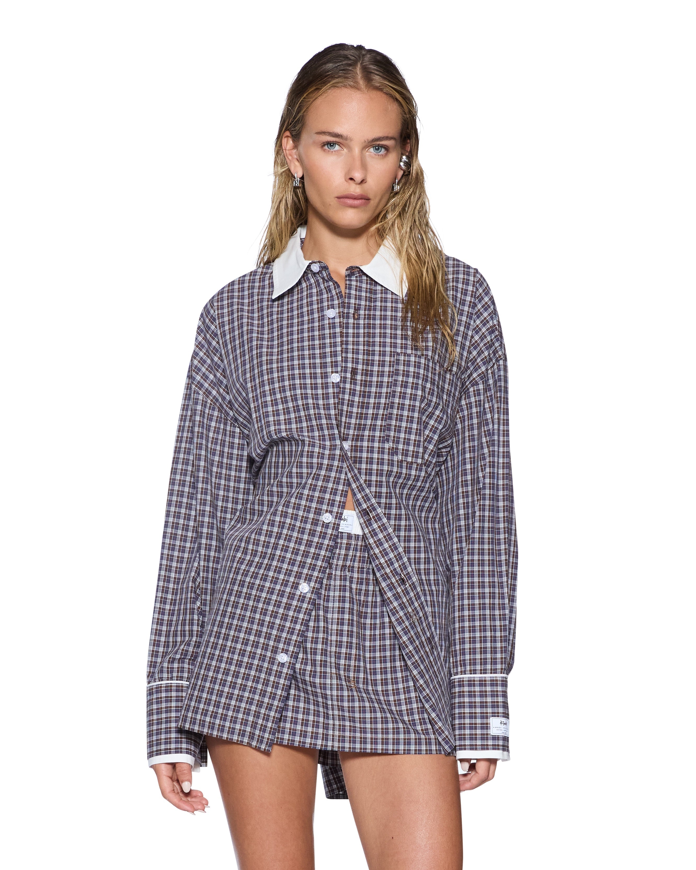 Oversized button-up shirt crafted from premium mid-weight 100% cotton in a custom handloom plaid, featuring a seasonal chocolate, blue, red, and white check. Designed with a contrast collar, double-layer cuffs, contrast piping on the back yoke, and a curved hem. Finished with a centre-front button closure, exaggerated cuffs, Ksubi-branded buttons, and signature T-box embroidery.