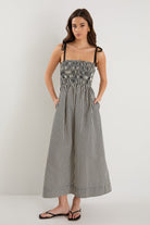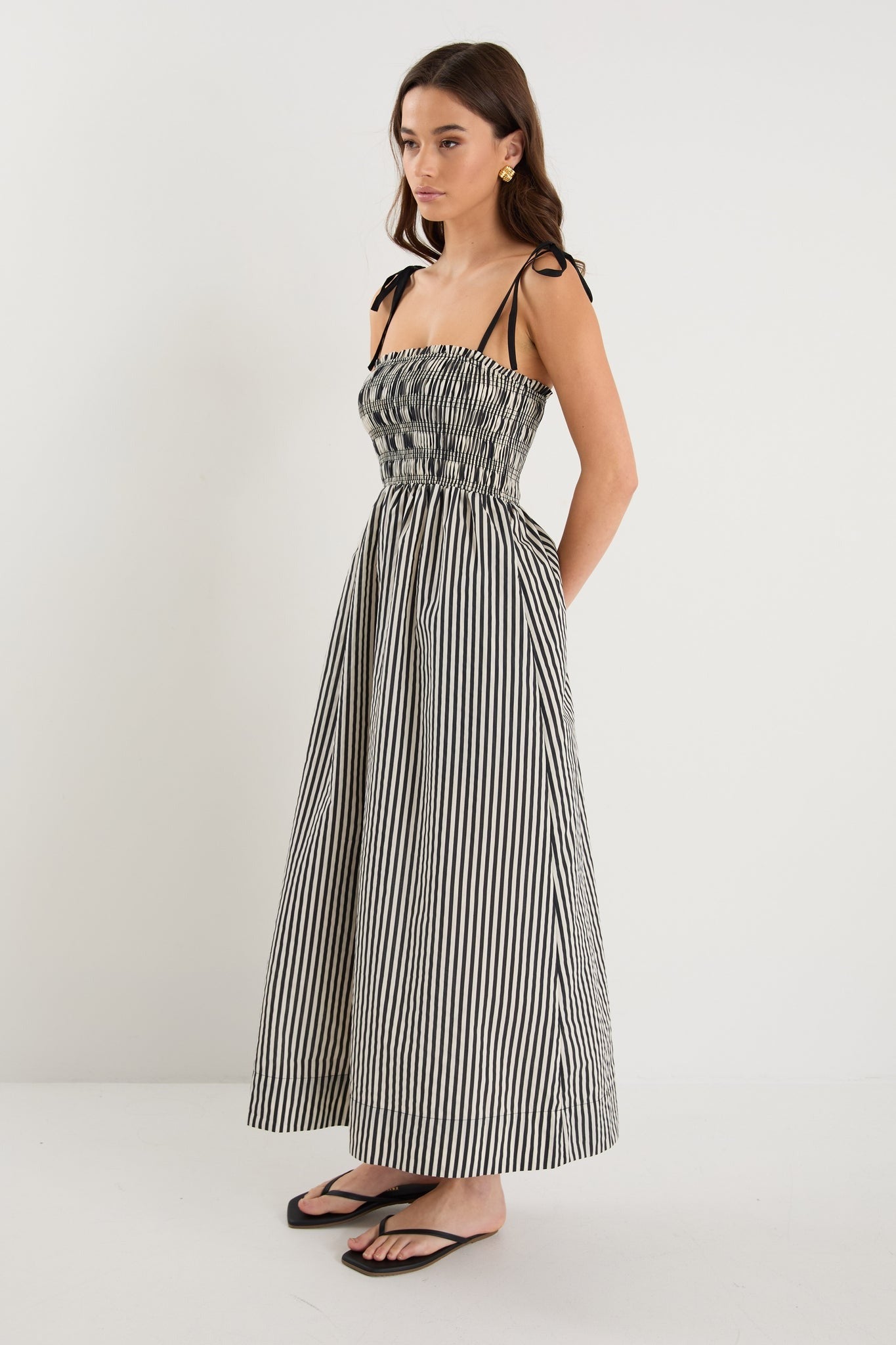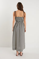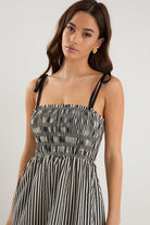 The Black & Cream Stripe Shirred Dress from Among The Brave is a chic summer staple with timeless detailing. Designed with adjustable tie straps and a shirred bodice for a flattering, comfortable fit, it flows into a relaxed a-line silhouette. The vertical stripe pattern elongates the frame, while its cotton-rich fabric blend offers breathability and ease of movement.